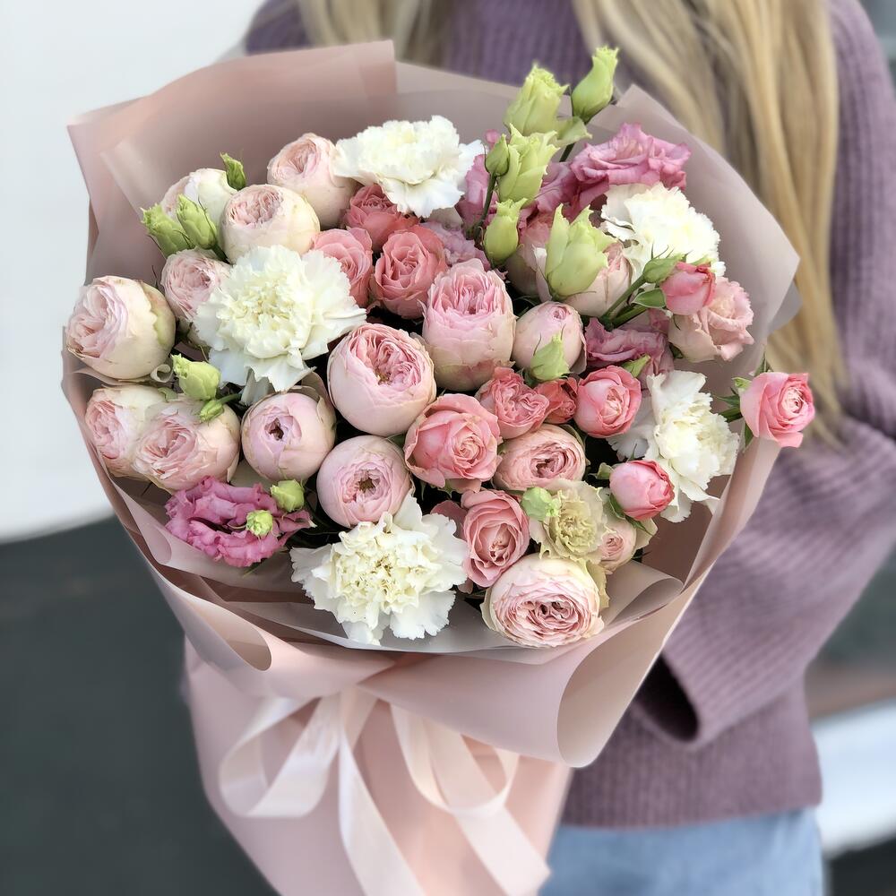 Кустовая роза - 7 шт. Эустома - 3 шт. Диантус - 5 шт.